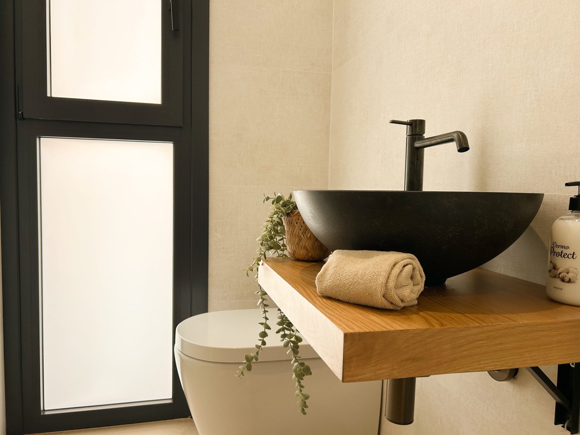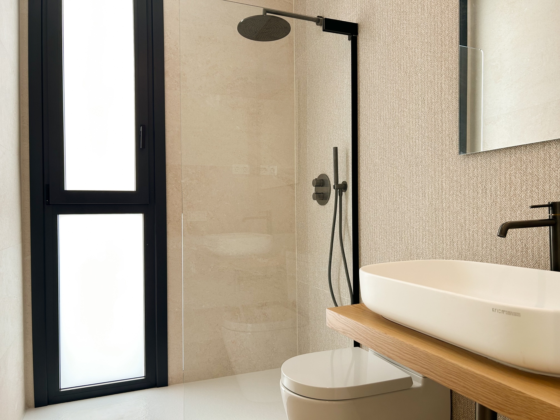 Upstairs, all bedrooms are en-suite, opening to private terraces. Bathrooms are by Porcelanosa, setting a refined tone throughout. Comfort is guaranteed with aerothermal underfloor heating, ducted cooling, and photovoltaic energy support. A full smart-home system (SIMON 270) lets you control ambience at a touch.