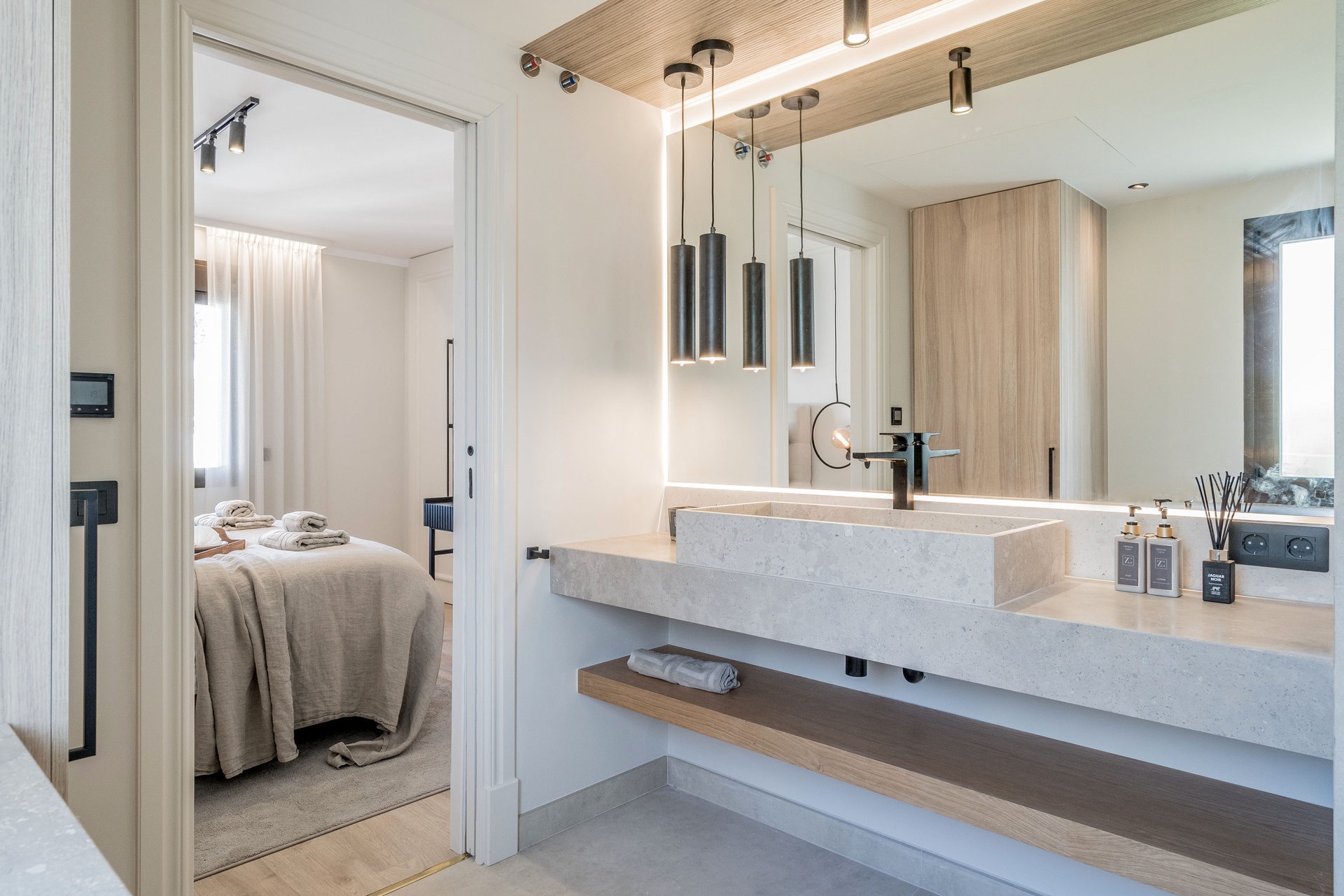 Throughout the property, you’ll find 14 tons of natural stone, adding weight and character to its luxurious aesthetic. The private plunge pool and warm wooden parquet flooring enhance both comfort and style. Bathrooms are equipped with HansGrohe taps and rain showers, delivering a spa-like experience at home.