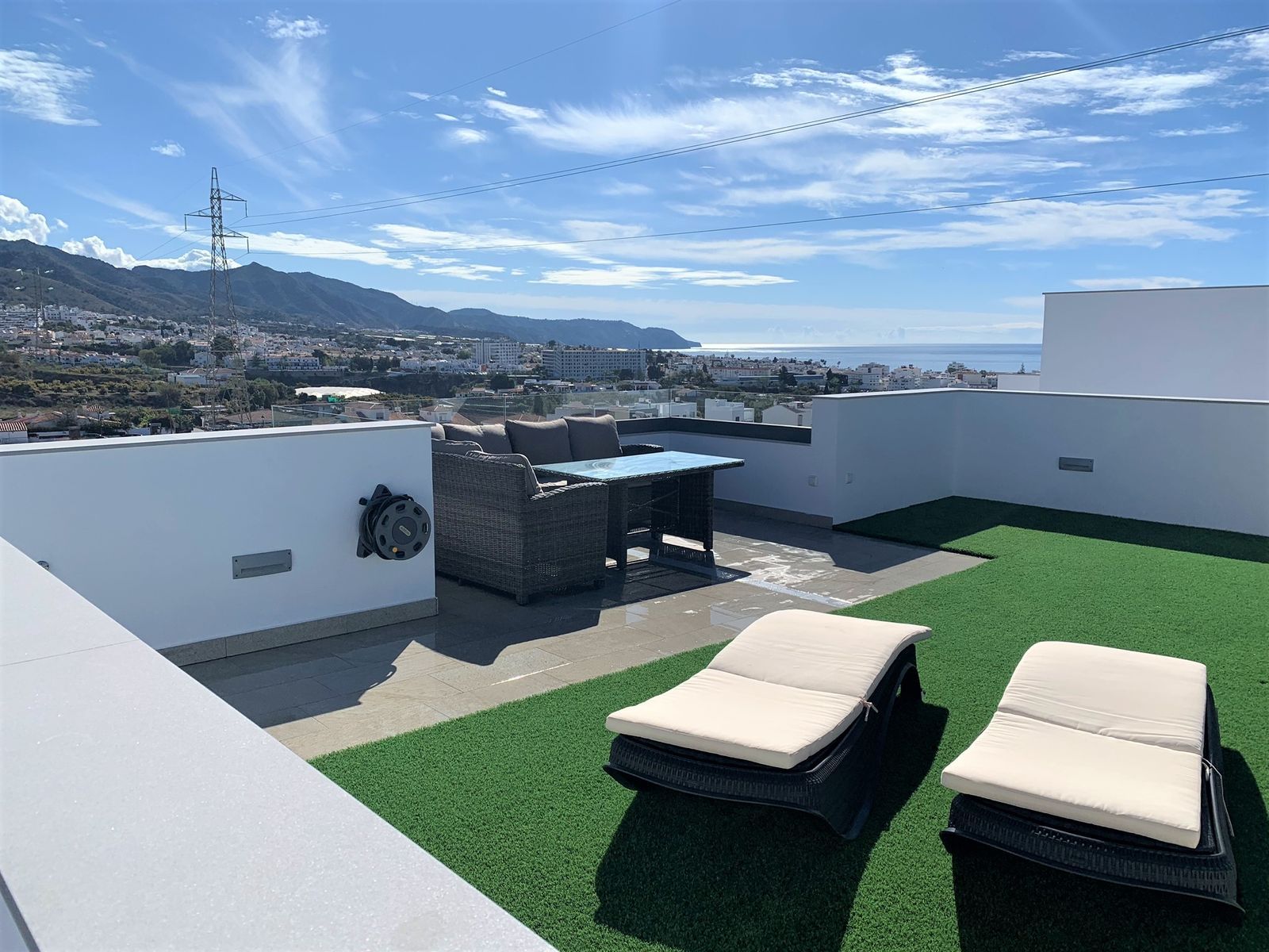 In the hallway off these three bedrooms, are large built-in wardrobes with sliding doors. Here we also have the exit to the house's large sun terrace, where you can enjoy 360ยฐ views of the Mediterranean Sea, the Almijara Mountains and the centre of Nerja. The obvious place to lie and sunbathe during the day, and later spend the summer evenings enjoying the sunset and the balmy breeze.